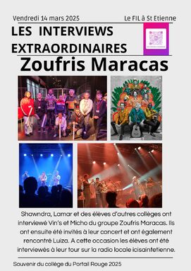 Ce vendredi 14 mars 2025, nous avons interviewé un chanteur et un guitariste Vincent et Vincent surnommés "Vin's et Micho" du groupe "Zoufris Maracas". Vin's et Micho sont les créateurs du groupe. L'interview des artistes s'est déroulé au Fil à Saint-Etienne. Ensuite, nous avons assisté au concert offert par le Fil en accord avec les artistes.